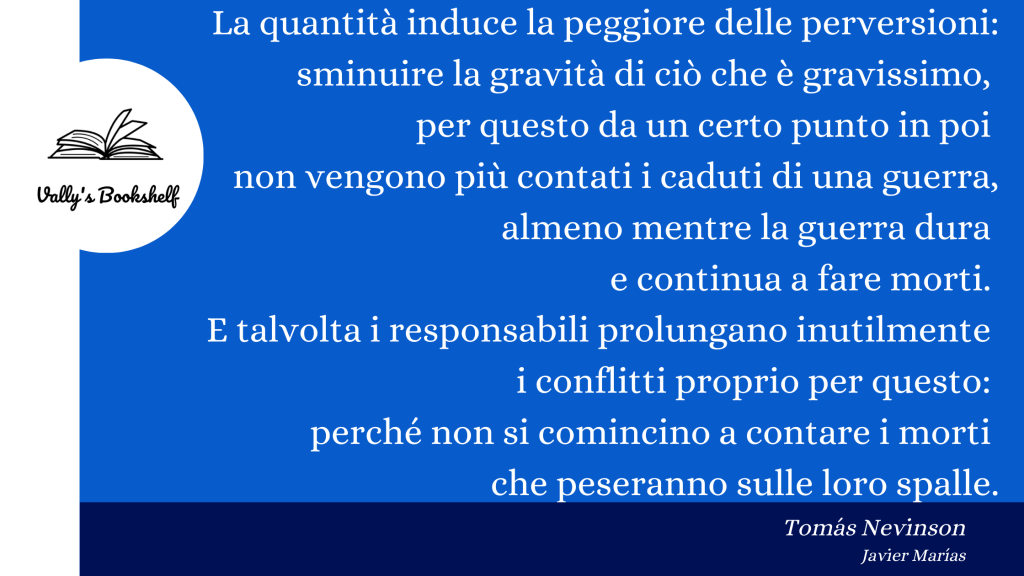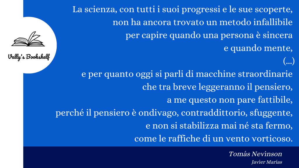 Un romanzo seducente, divertente e tipicamente JavierMariasiano – un termine appena coniato dalla sottoscritta – perché ha quella caratteristica folle di essere senza tempo: è soltanto e semplicemente universale.
